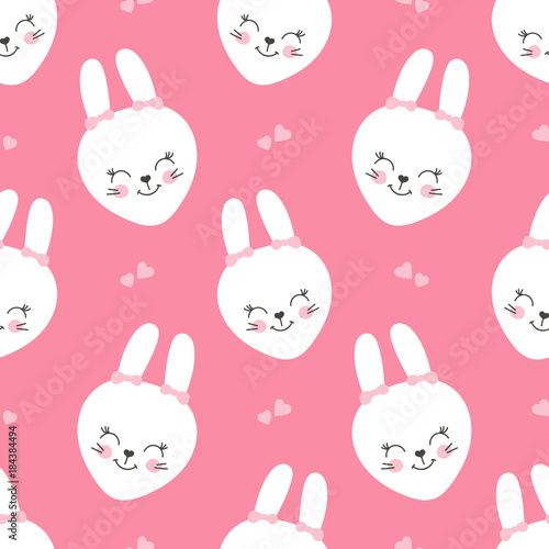 Cute Baby Pattern With Little Bunny Cartoon Animal Girl Print Vector Seamless Sweet Pink Background With White Rabbit Faces And Hearts For Children Fabric Home Textile Nursery Or Birthday Party Stock Vector
