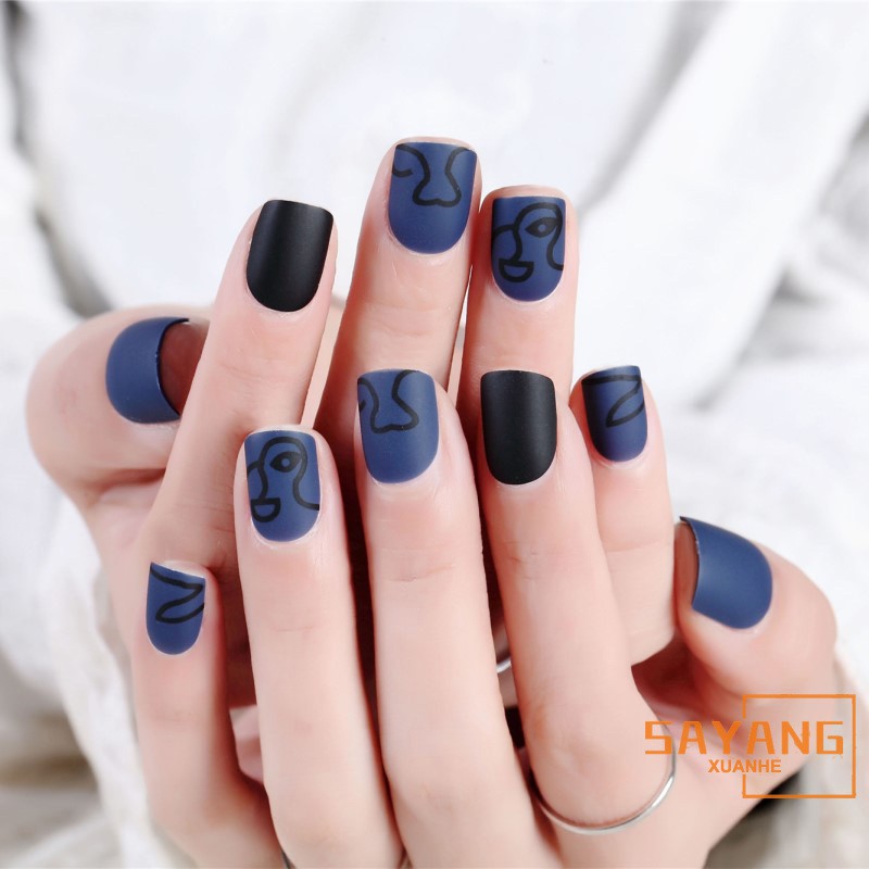 Sayang Girls New Personality Simple Style Matte Black And Blue False Nail Art Stickers Short Square Diy Fake Nails Shopee Philippines