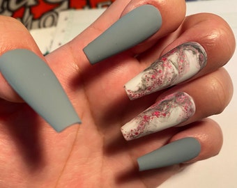 Matte Pink And Glossy Dark Gray Press On Glue On Nails Etsy