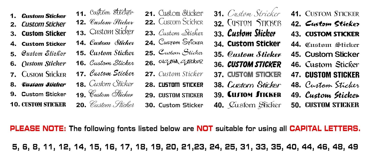 You can enter in any text youd like customize the font color and size as it is made to order and will stick on any smooth surface.