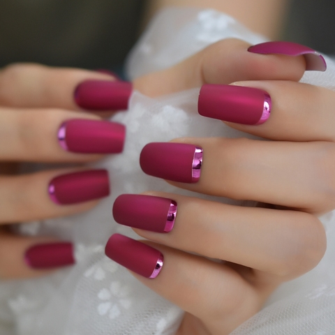 Buy Online Slim Square Fake Nails Matte Rose Red With Metallic Moo Medium Size Frosted Artificial Acrylic Nail Art Tips With Glue Sticker Alitools